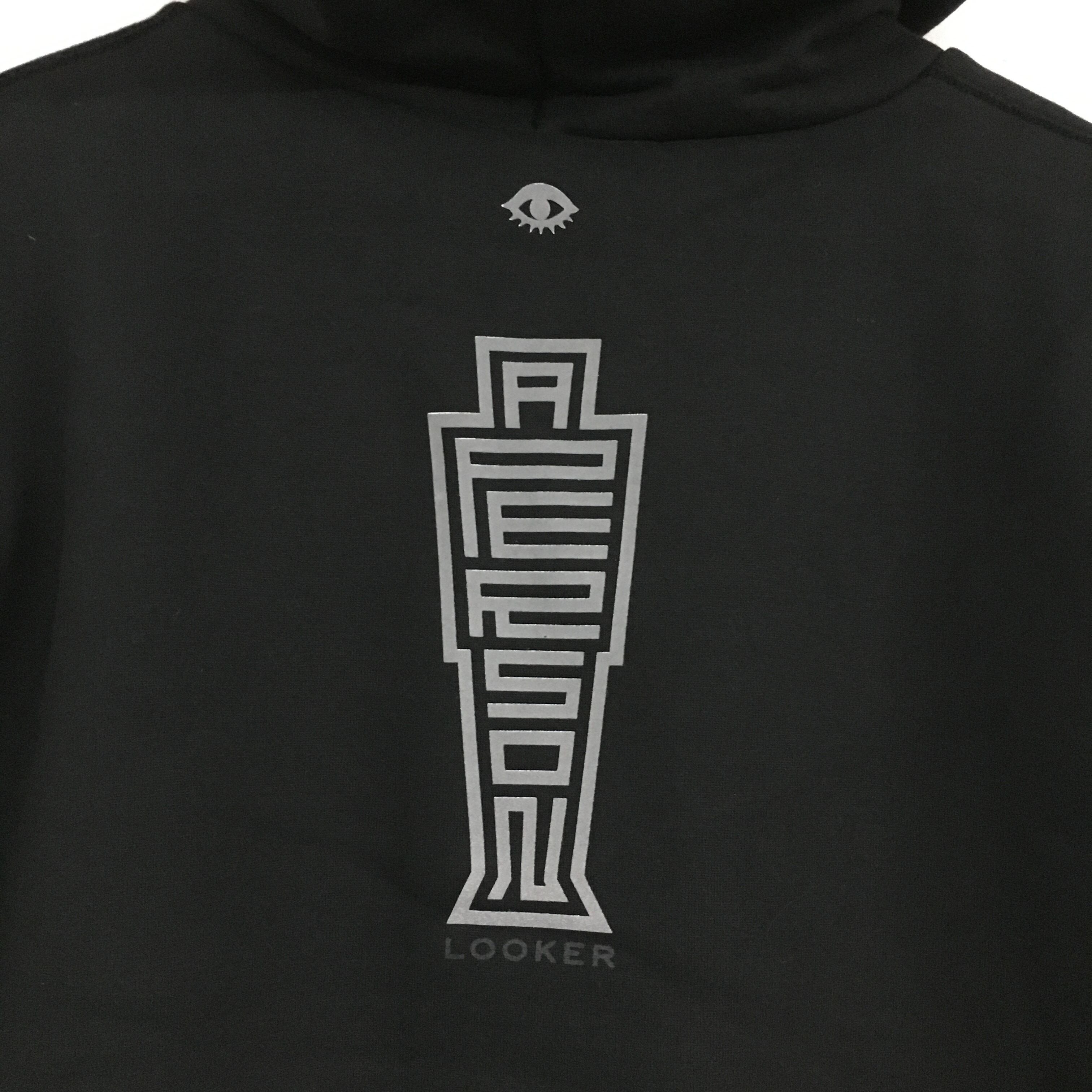 プリントは今まで誰もやったことの無いプリントをとプリント工場の長と考え青く光る蓄光インクの上にマットシルバーリフレクターを乗せパッと見はライトグレーのプリントに見え、夜になれば薄っすらと青く光り、写真のフラッシュや車のライトにはリフレクターで反射し四六時中このA PERSONの人型のロゴが沈まず佇んでいる様を見せてくれます。