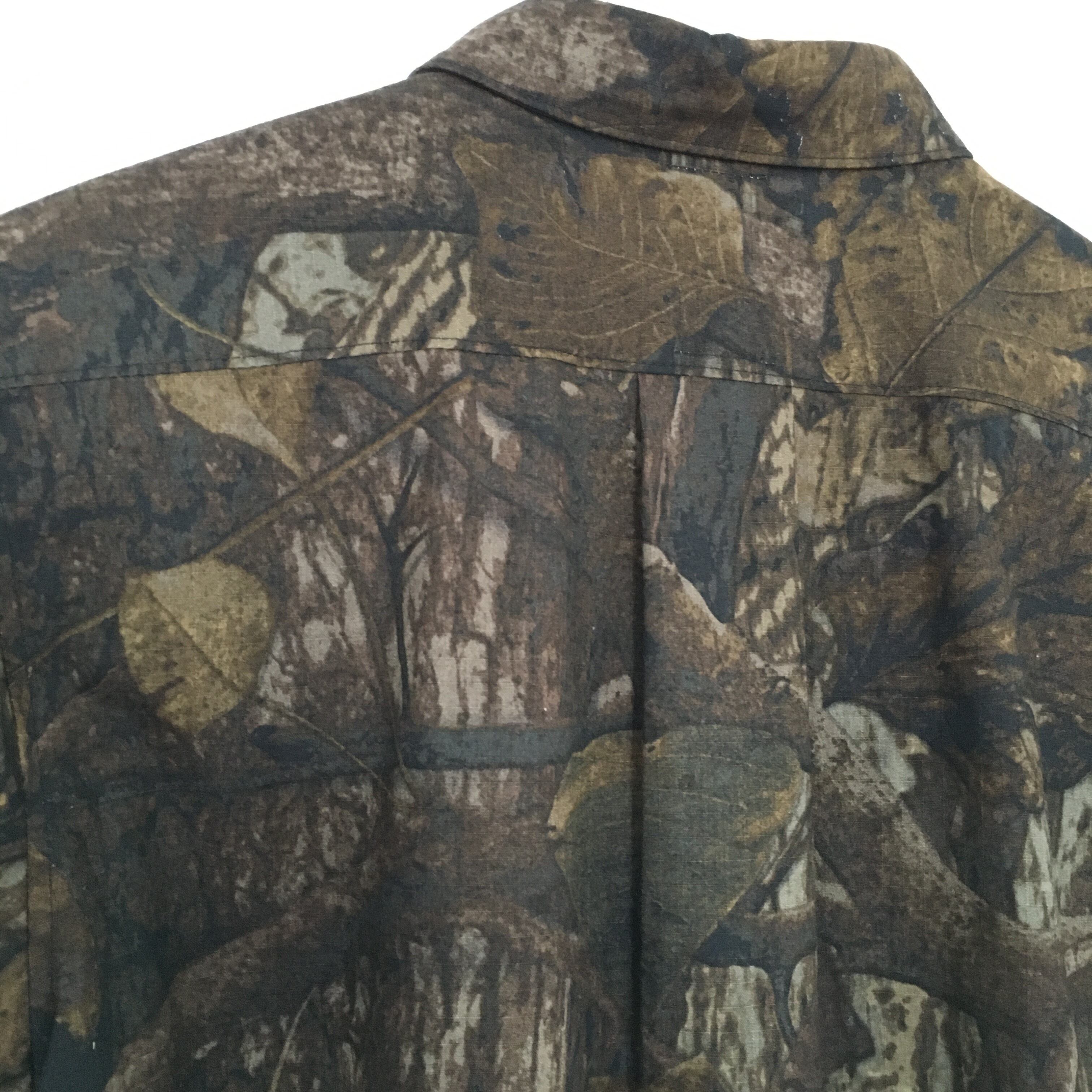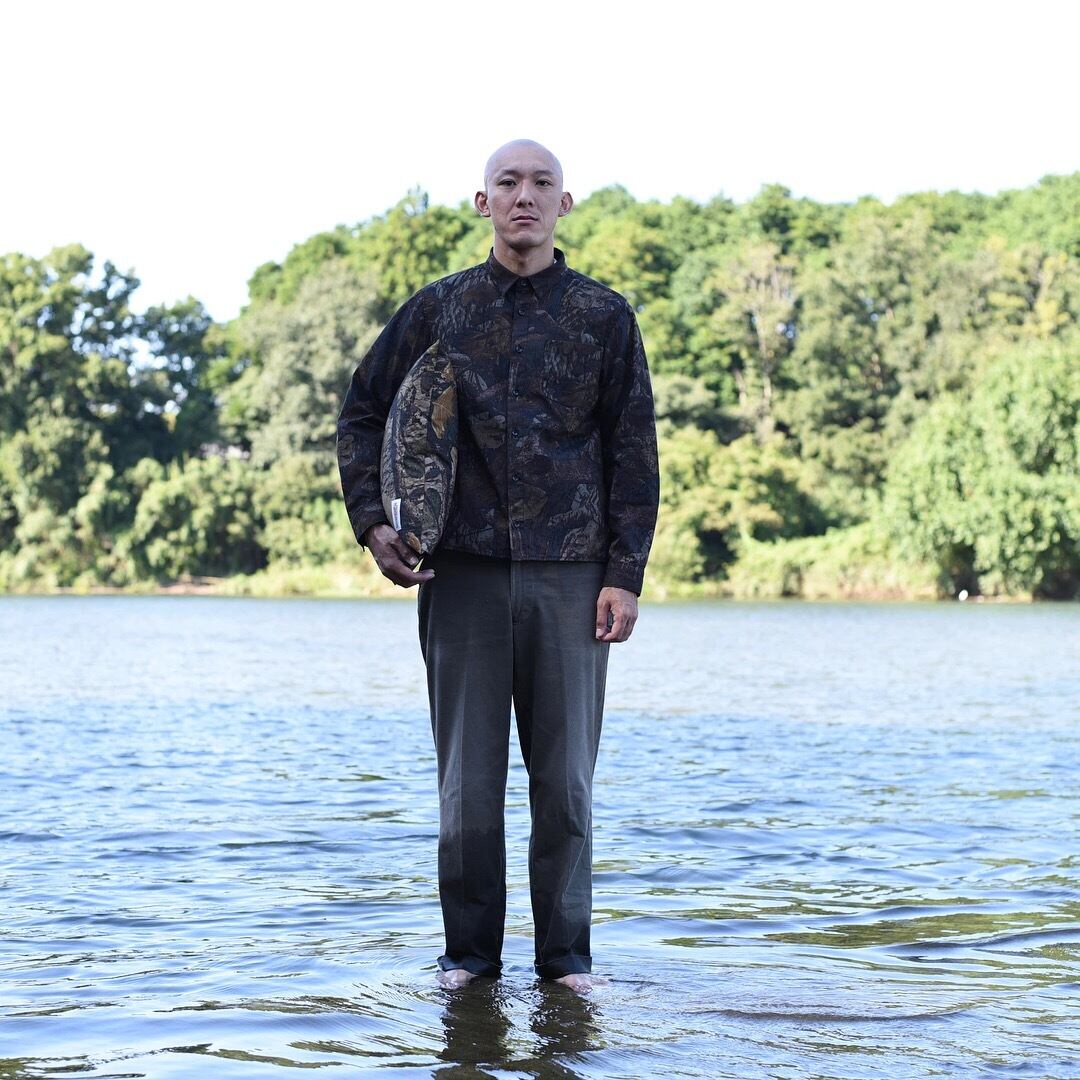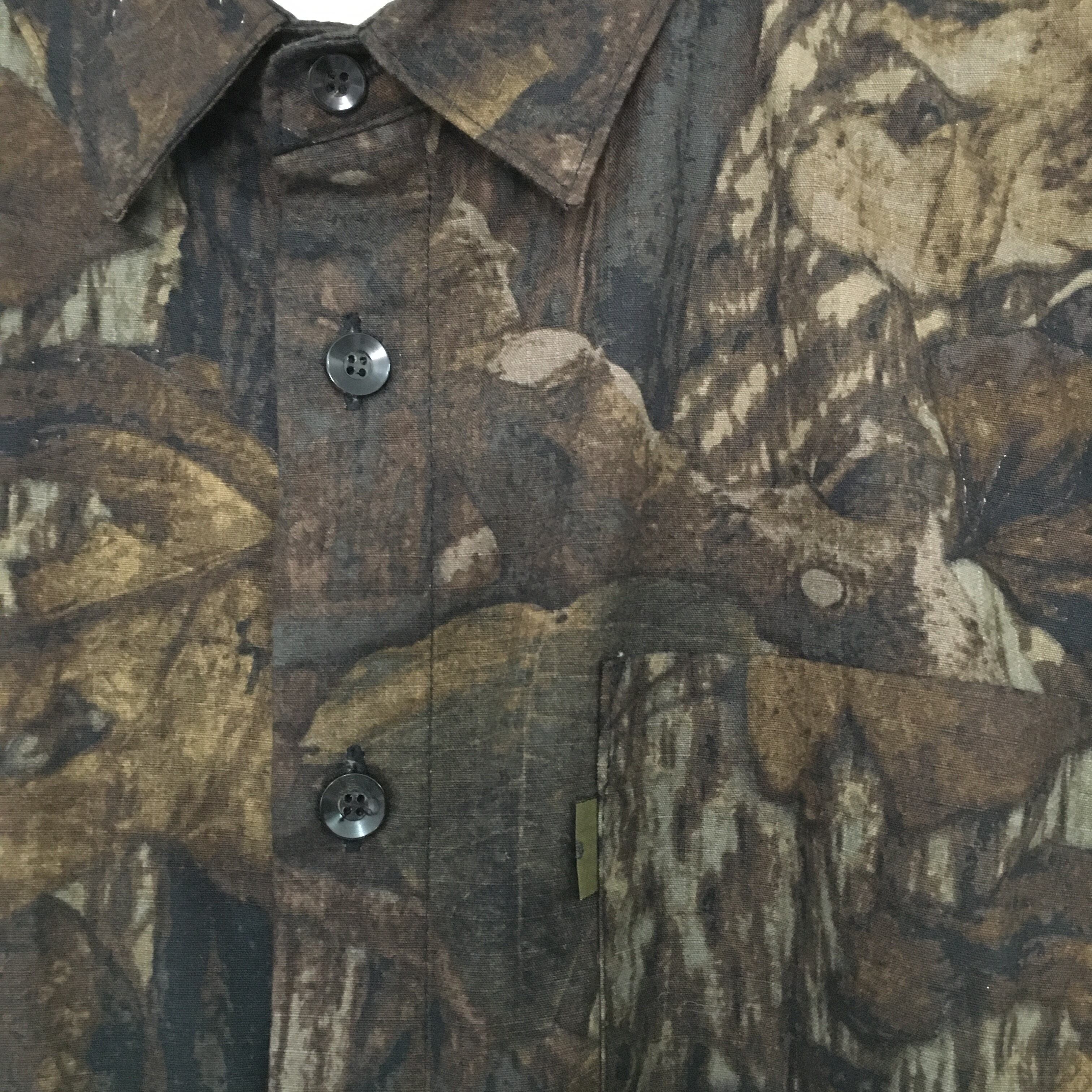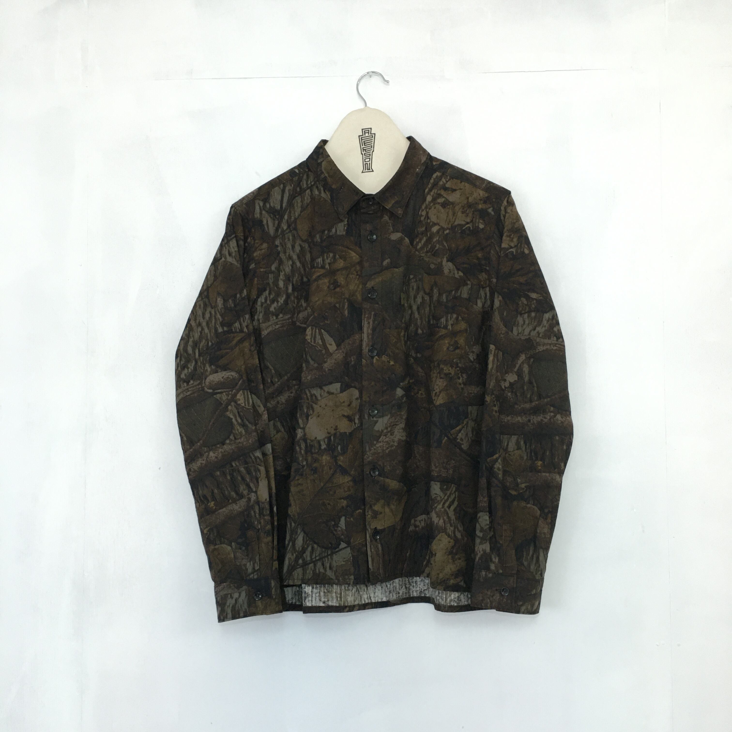 一からパタンナーさんにパターンを起こして頂き、自身で見つけた国産の綿100%リップストップリアルツリーカモフラージュプリントの生地を使い、自ら裁断し縫製をして仕上げからタグ付け袋詰めから発送までを含め全てを一人で完結する事によりより純粋で混じり気の無い無垢のクリエーションを届けたいと思って作ったシャツになります。(717 HAND MADE)