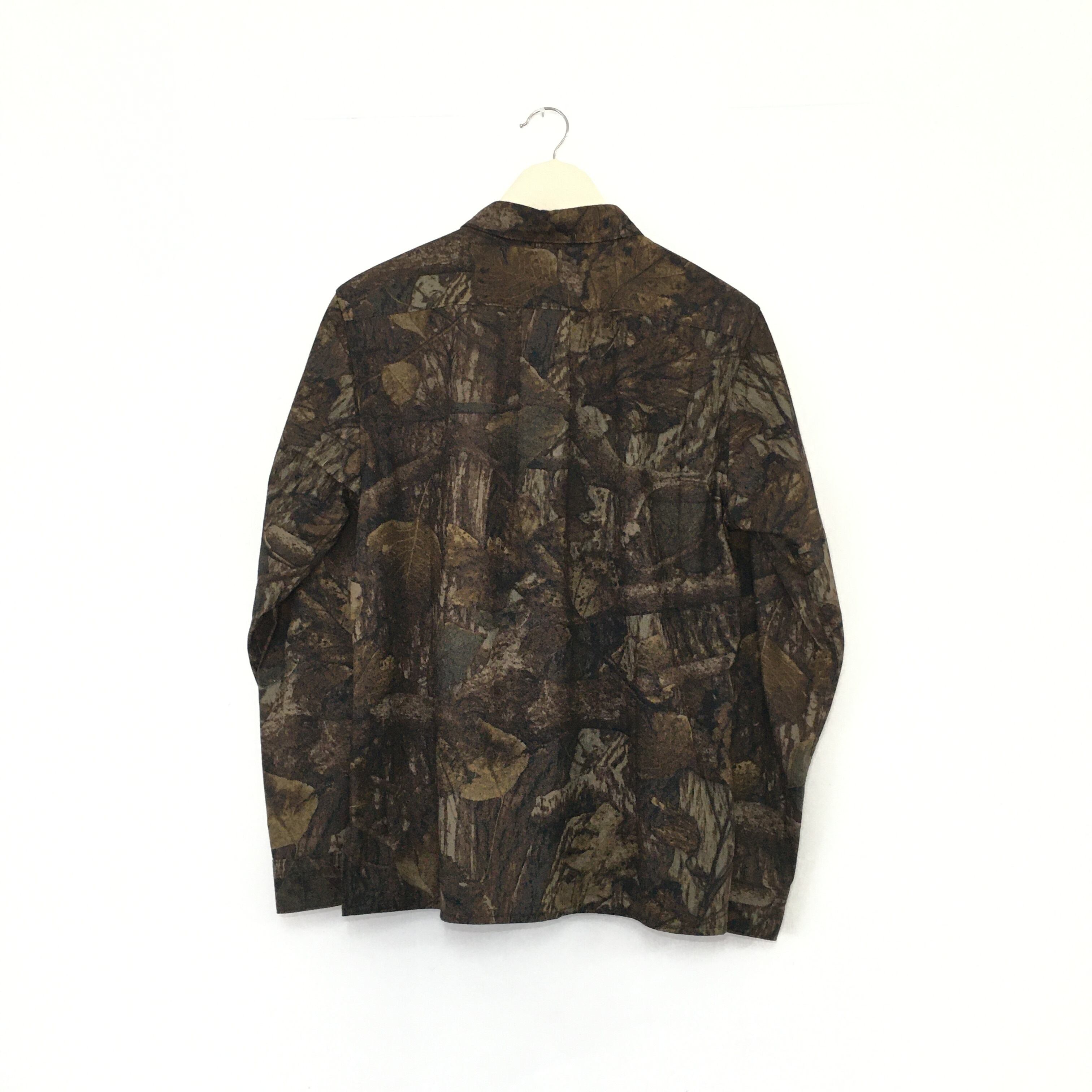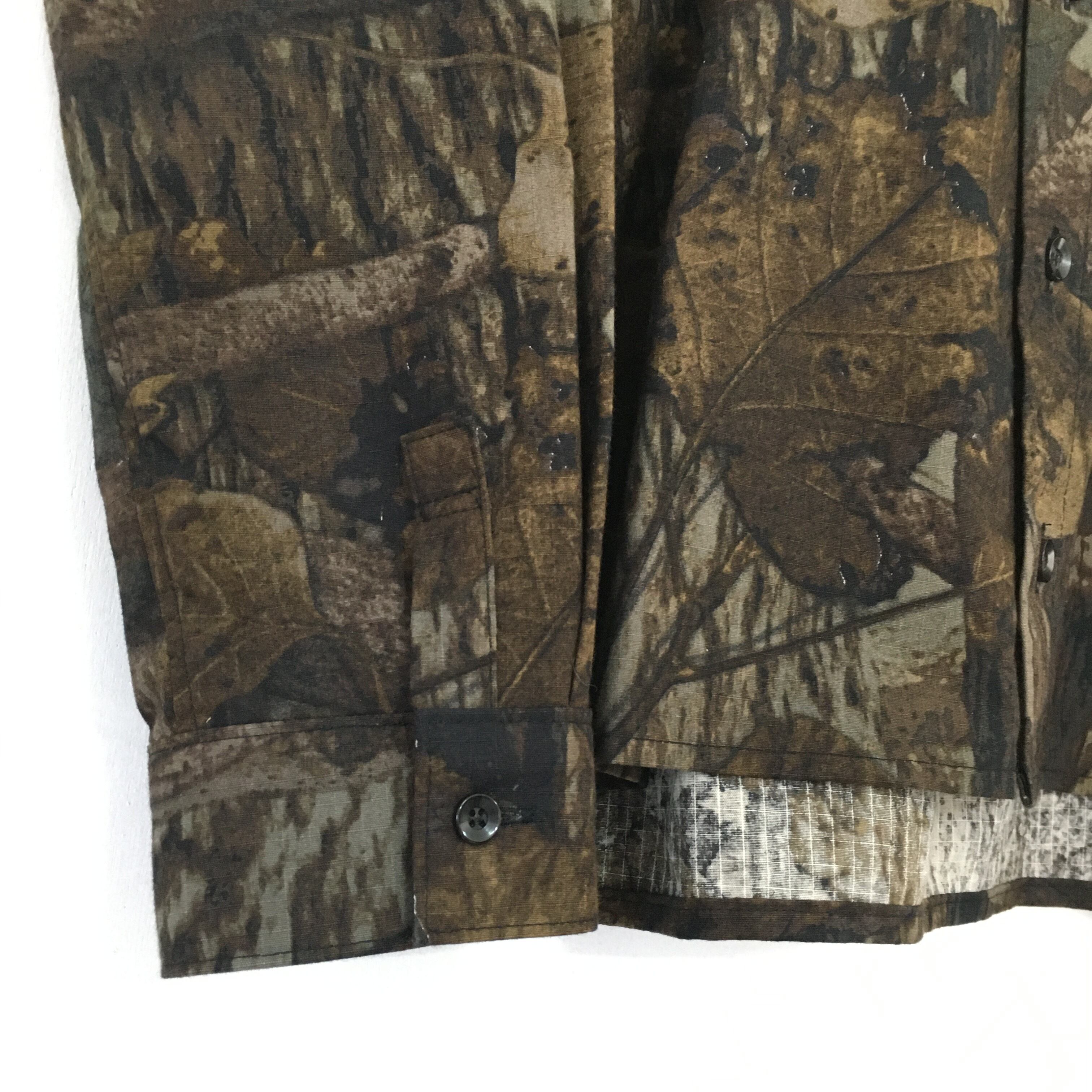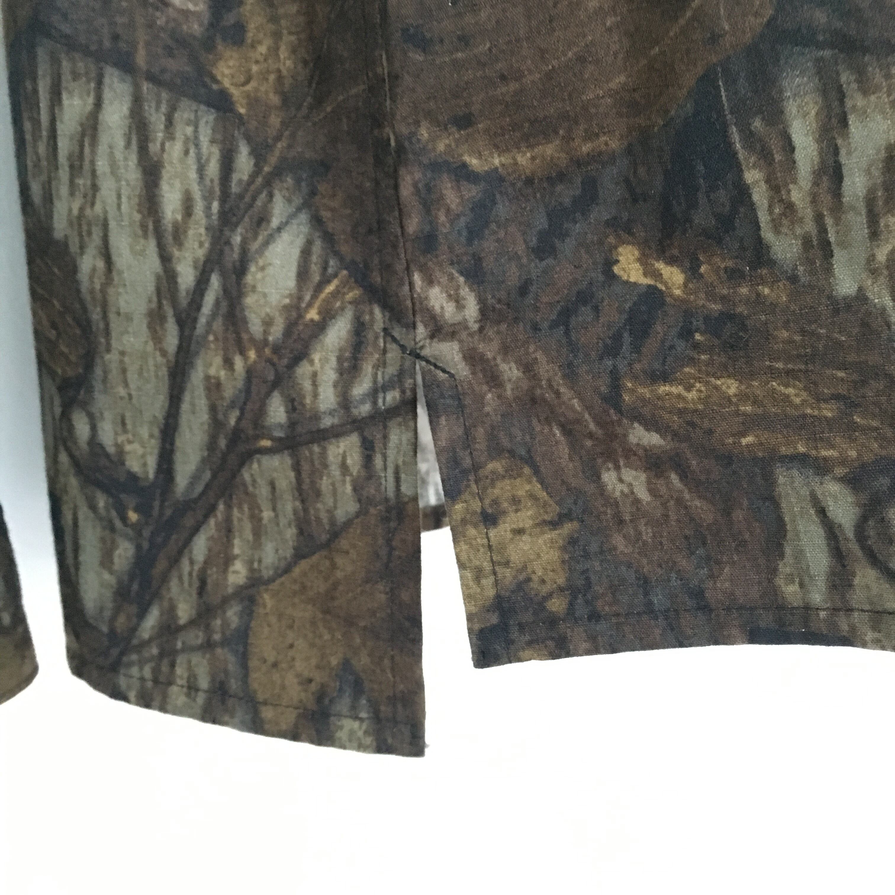 生地はリップストップの上にリアルツリーカモがプリントしてあり着始めの糊の効いたパリッとした状態から着て洗っていく程に柔らかくまたリップストップ生地特有の格子状の糸模様が浮かんで来る様子を楽しんで頂けます。