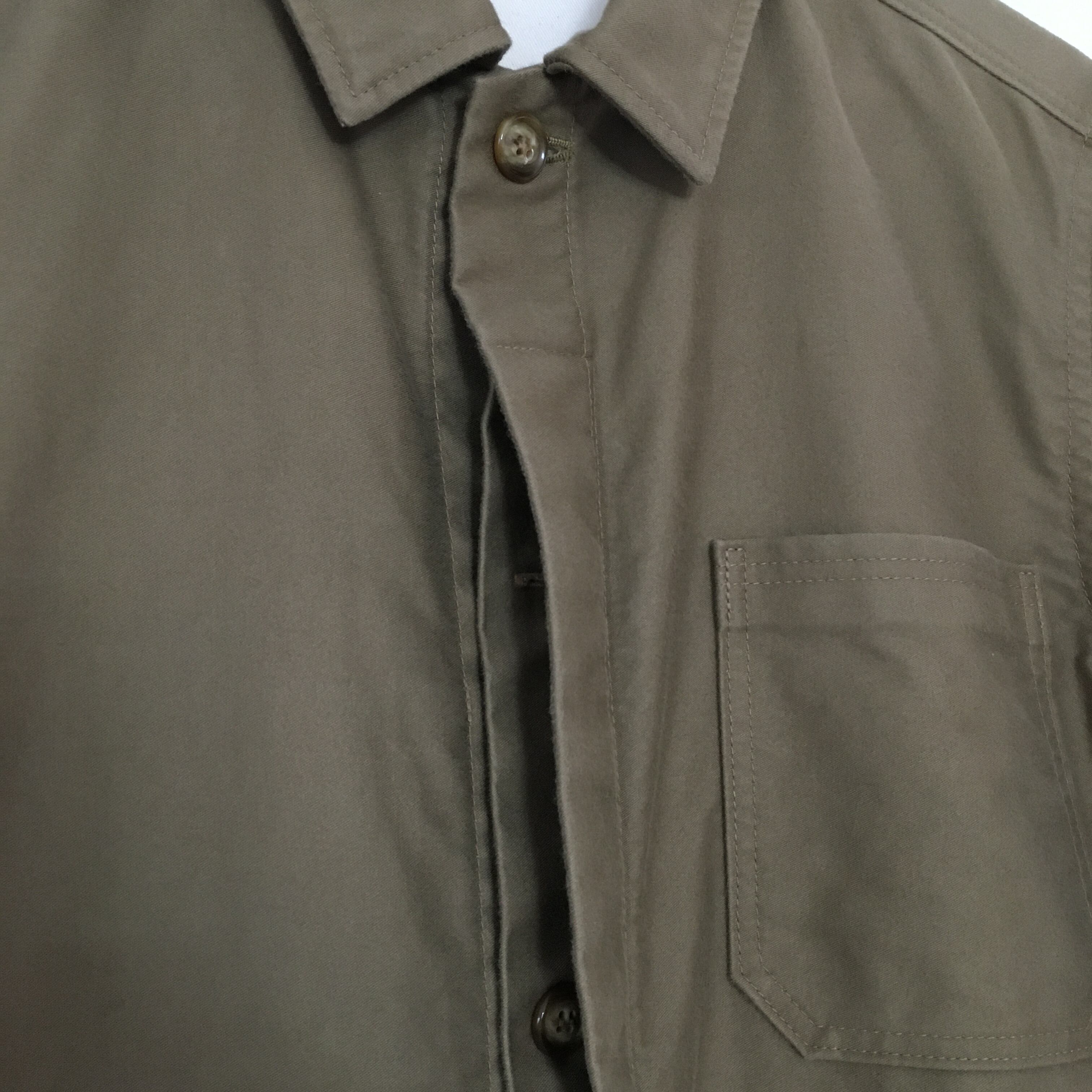 ディティール的な特徴と致しまして、襟は肩幅や全体のバランスから小さくし、逆に首回りは着る場合第一ボタンまで締めて着て頂きたいので少し広めの設定にして閉めたままでも窮屈に感じない様にしました(指二本分ぐらいのゆとり)
