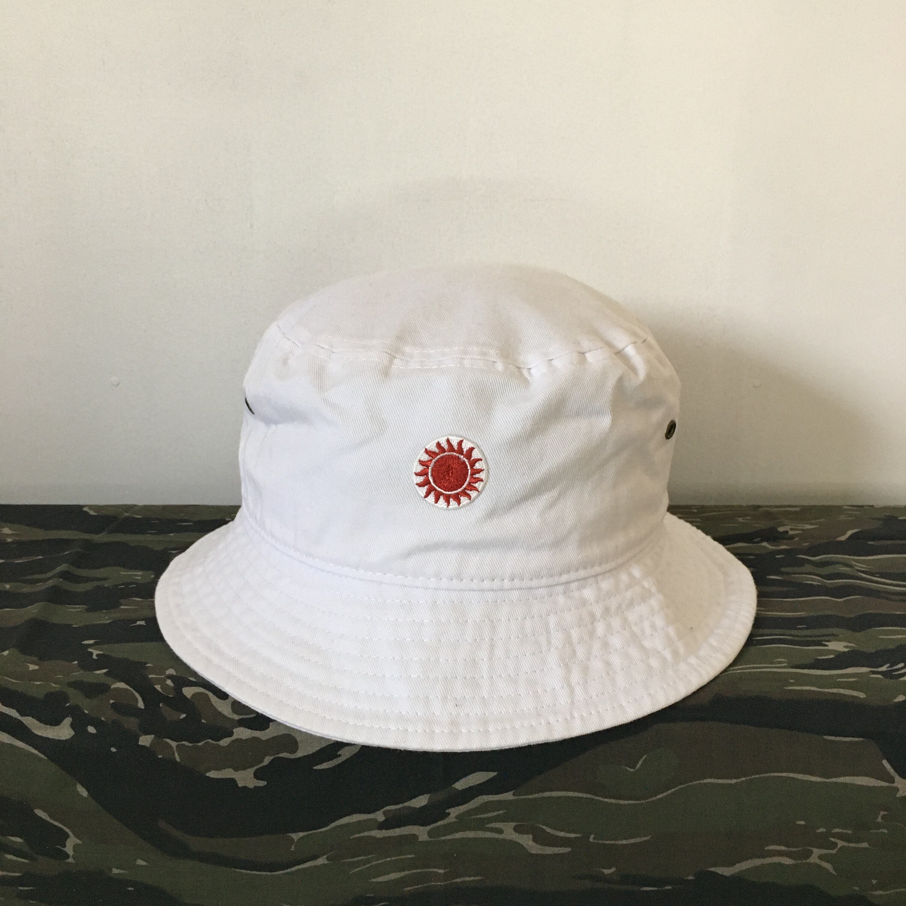 刺繍の設定で太陽の内側から放射する様子を表現したく中心点から放射状に広がって行くように糸を落とすことにより糸の反射や沈み込みで常に立体感が有りメラメラと燃えている様な見た目になる様刺繍致しました。