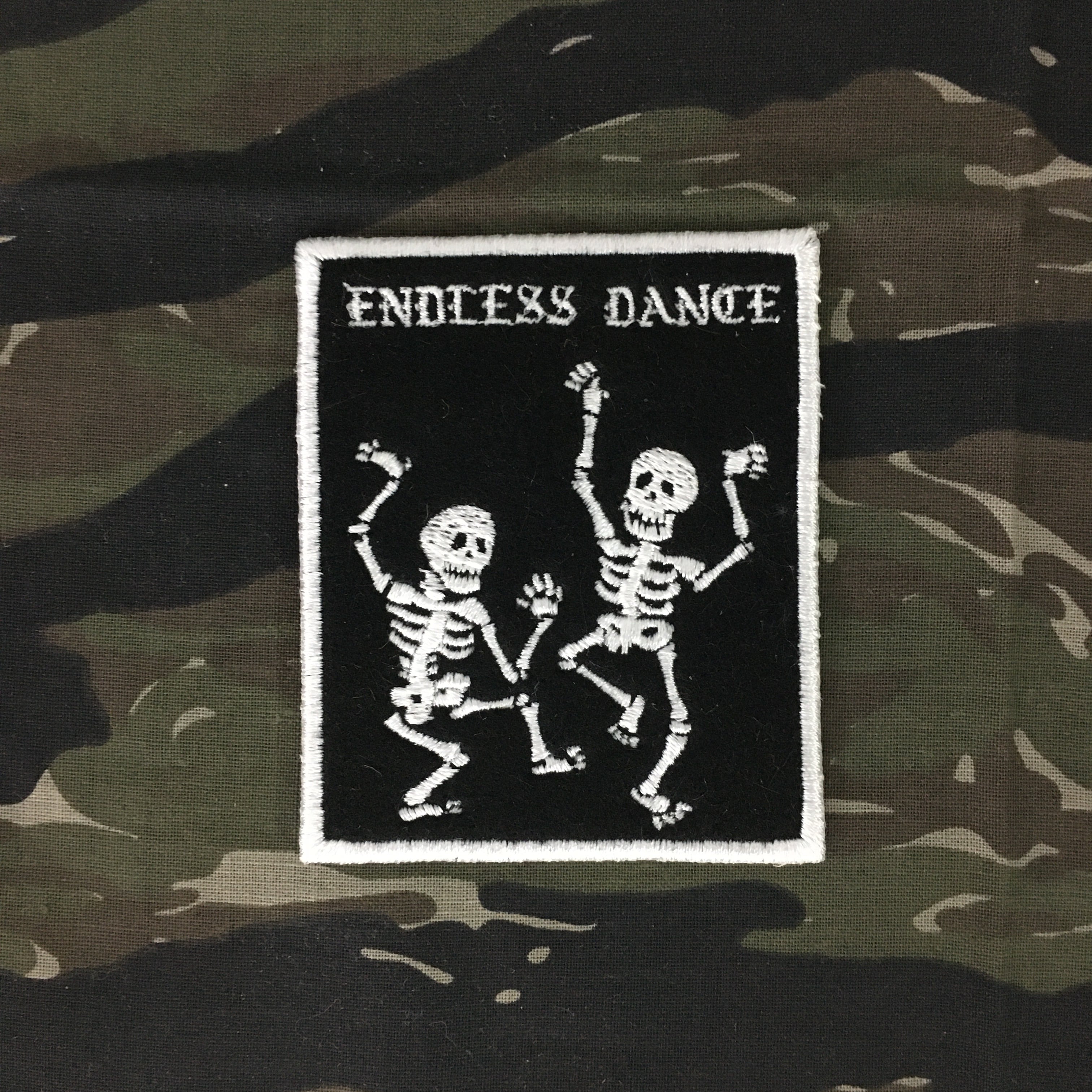 踊りたい人の気持ちを代弁するかの様に骸骨になっても踊り続けるダンス狂の姿をワッペンにしました。黒のフェルト地に白糸でパキッと乗せ経年変化でより明確な差を見せてくれます。