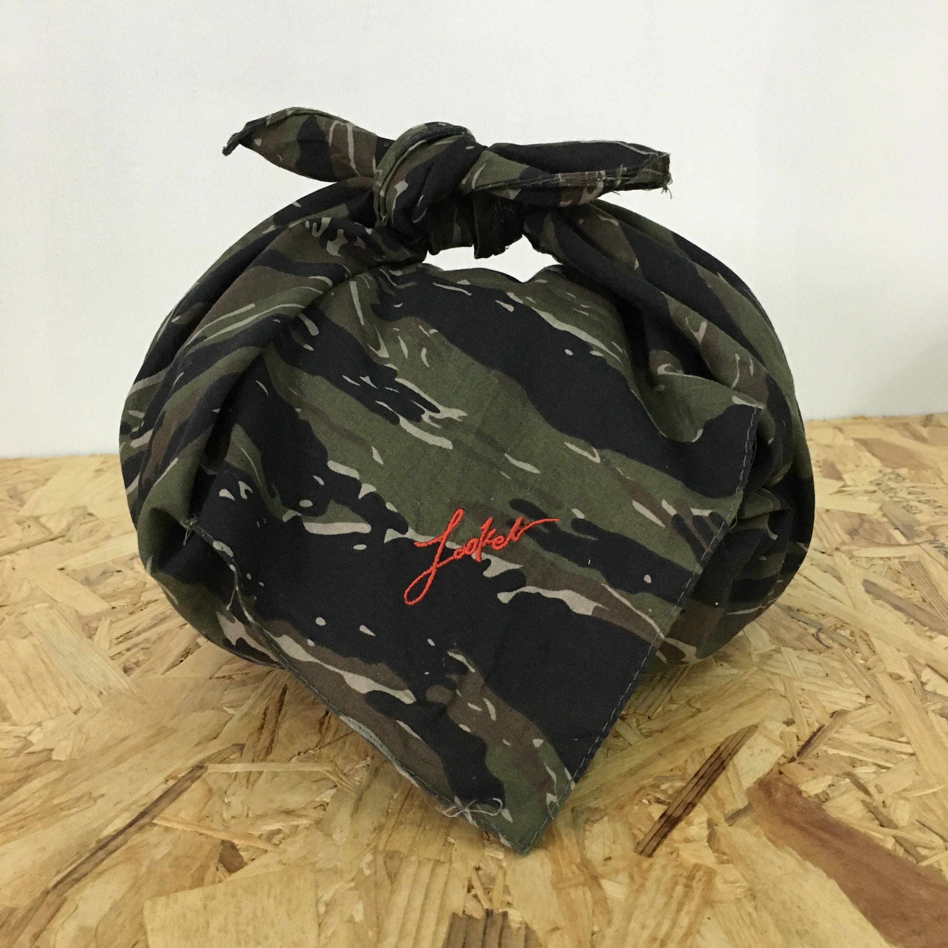日頃そこまで荷物の無い人間には風呂敷ほどの容量は無くてよく、風呂敷よりもタフなものは無いかと探していた時に見つけたこの生地は風呂敷では多分存在しないTIGER CAMO柄の見栄え、バンダナ生地のタフさ等が日常使いに最適です。