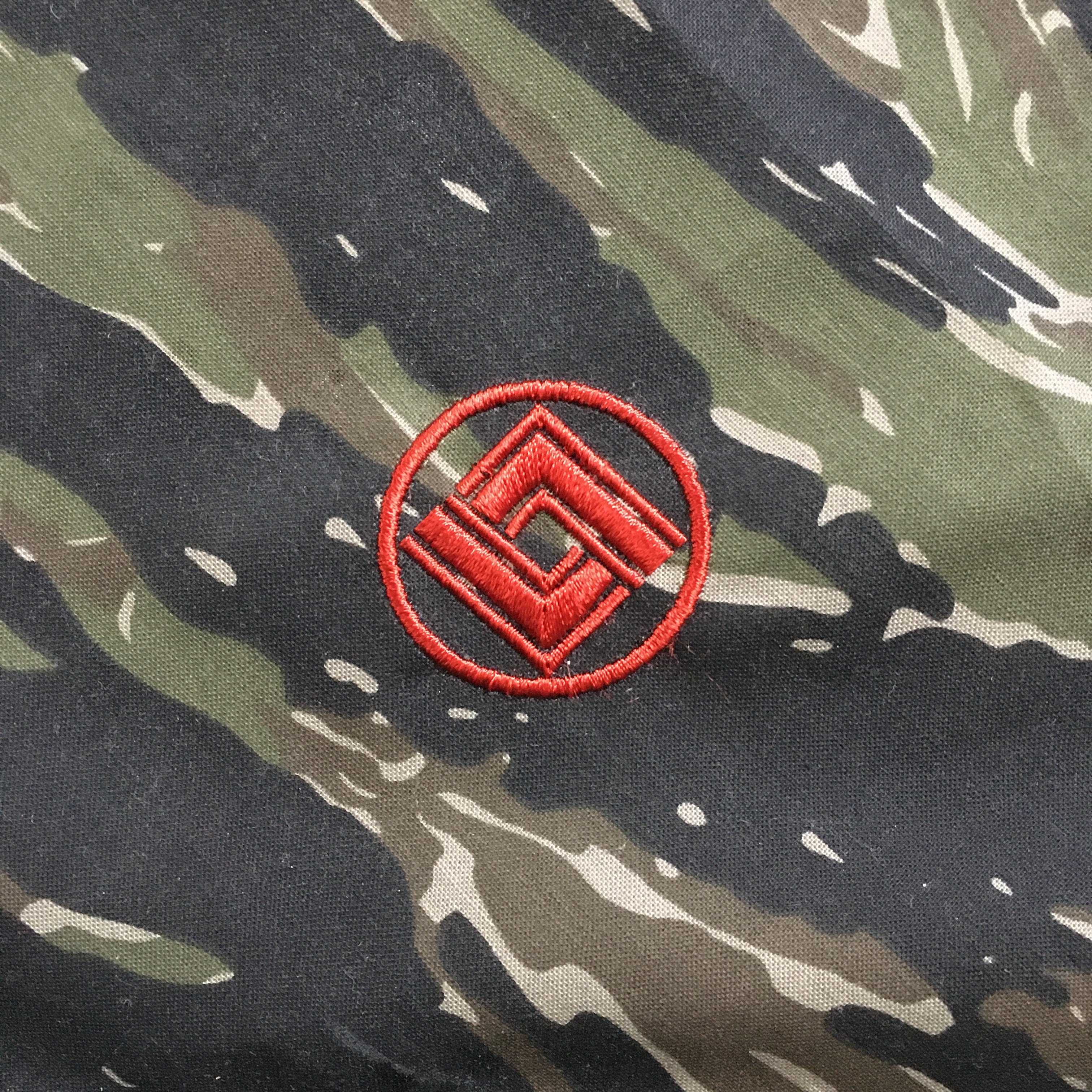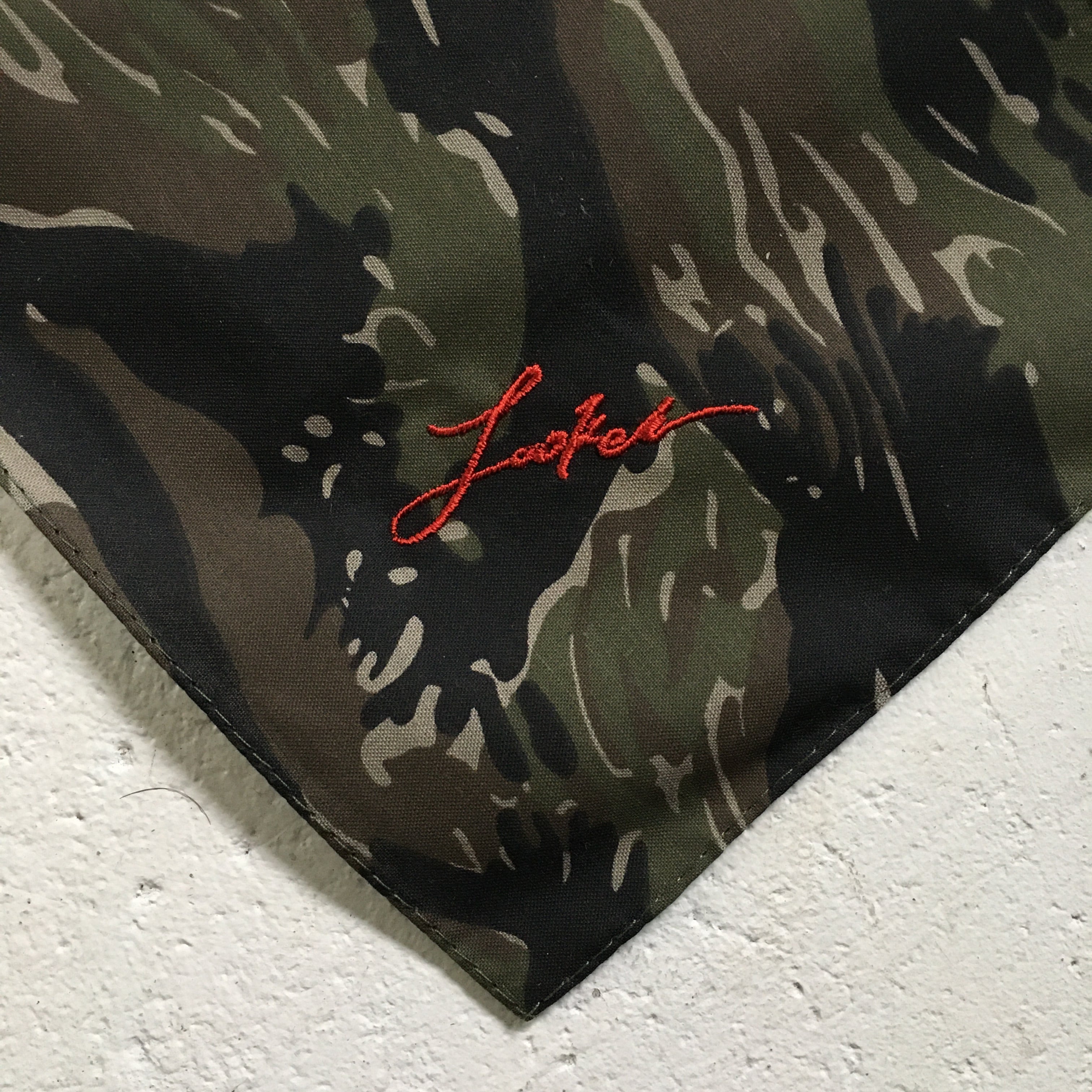 通常のバンダナが約50cm角ぐらいなのですがこれは68cm角ぐらいある大きいTIGER CAMOのバンダナに日本国旗の赤色と同色の糸で刺繍致しました。