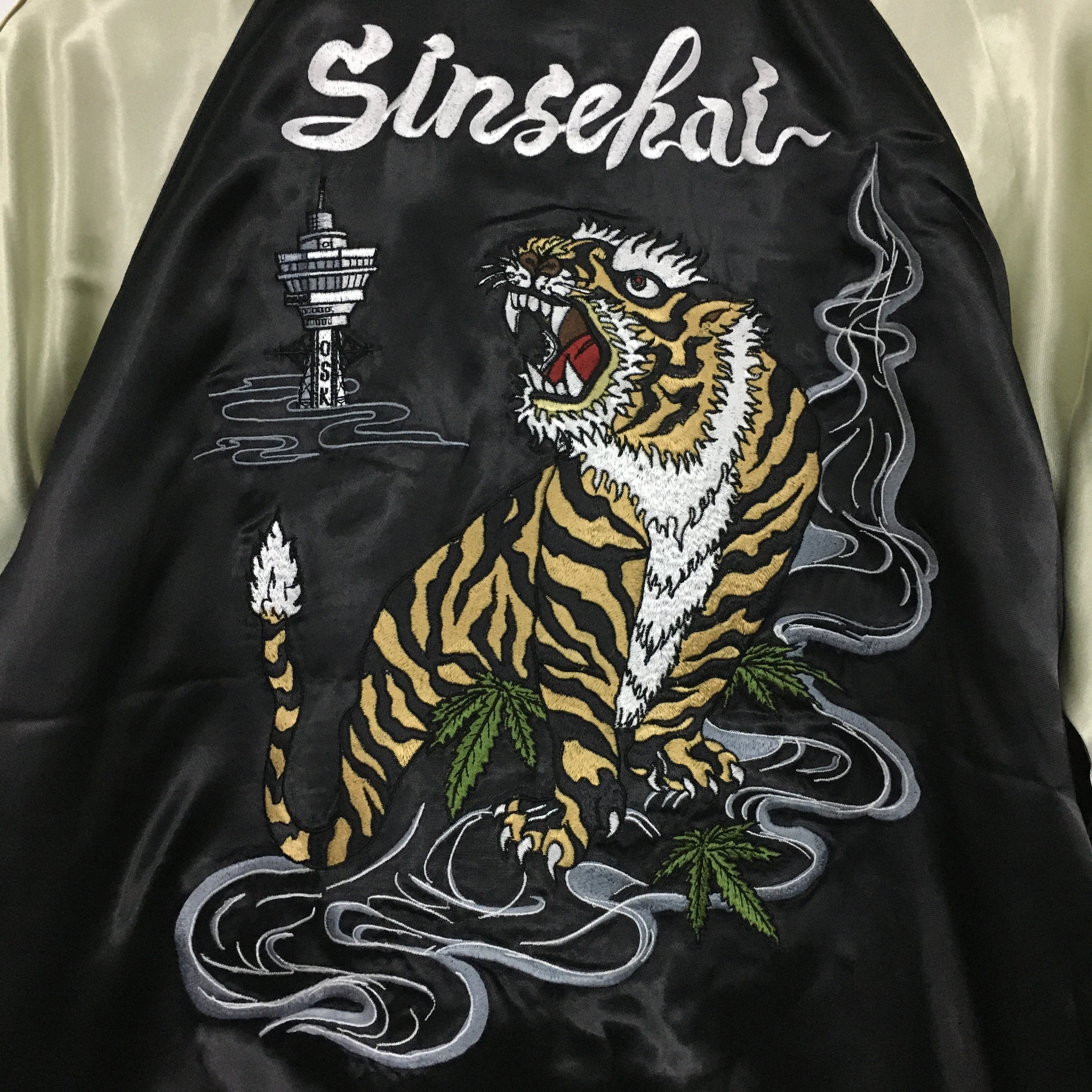 A面は両胸に左右違う表情の虎の顔を刺繍し背中にはSINSEKAIの文字と煙に跨り通天閣を睨む虎を背中中央に刺繍してあります。