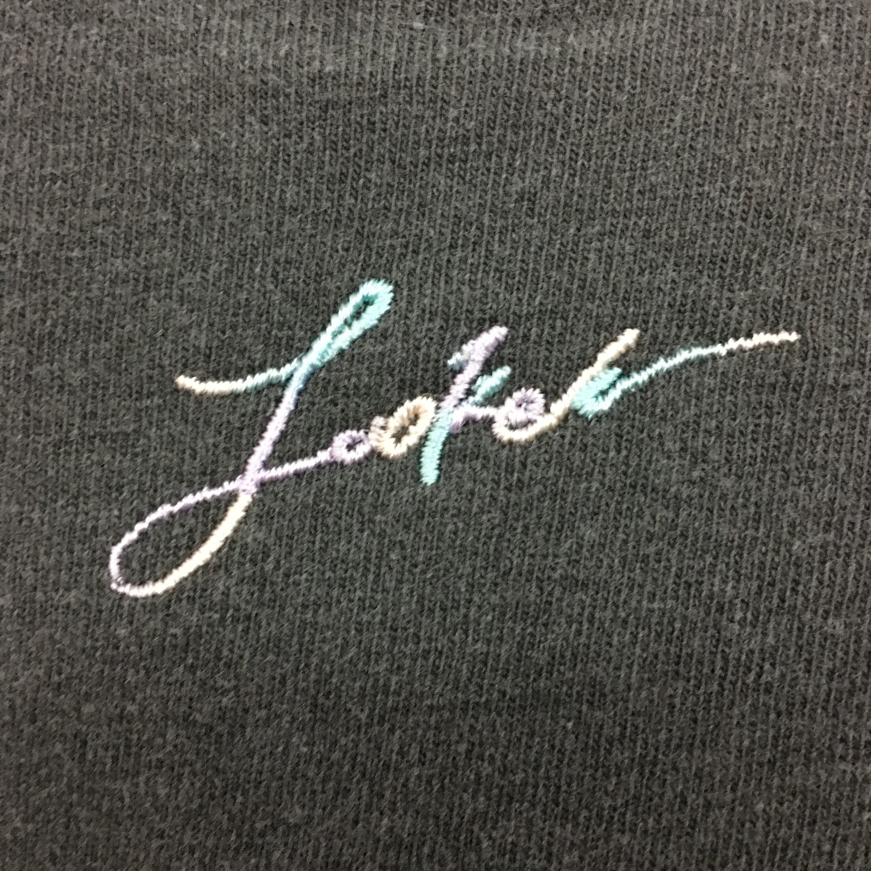 背中はシンプルにLOOKER SCRIPT LOGOを同じく色の変わる糸を使い首元に刺繍、前面との対比でイメージが強くなりすぎる事を抑え着やすくより長く愛用して頂ける様落とし込みました。