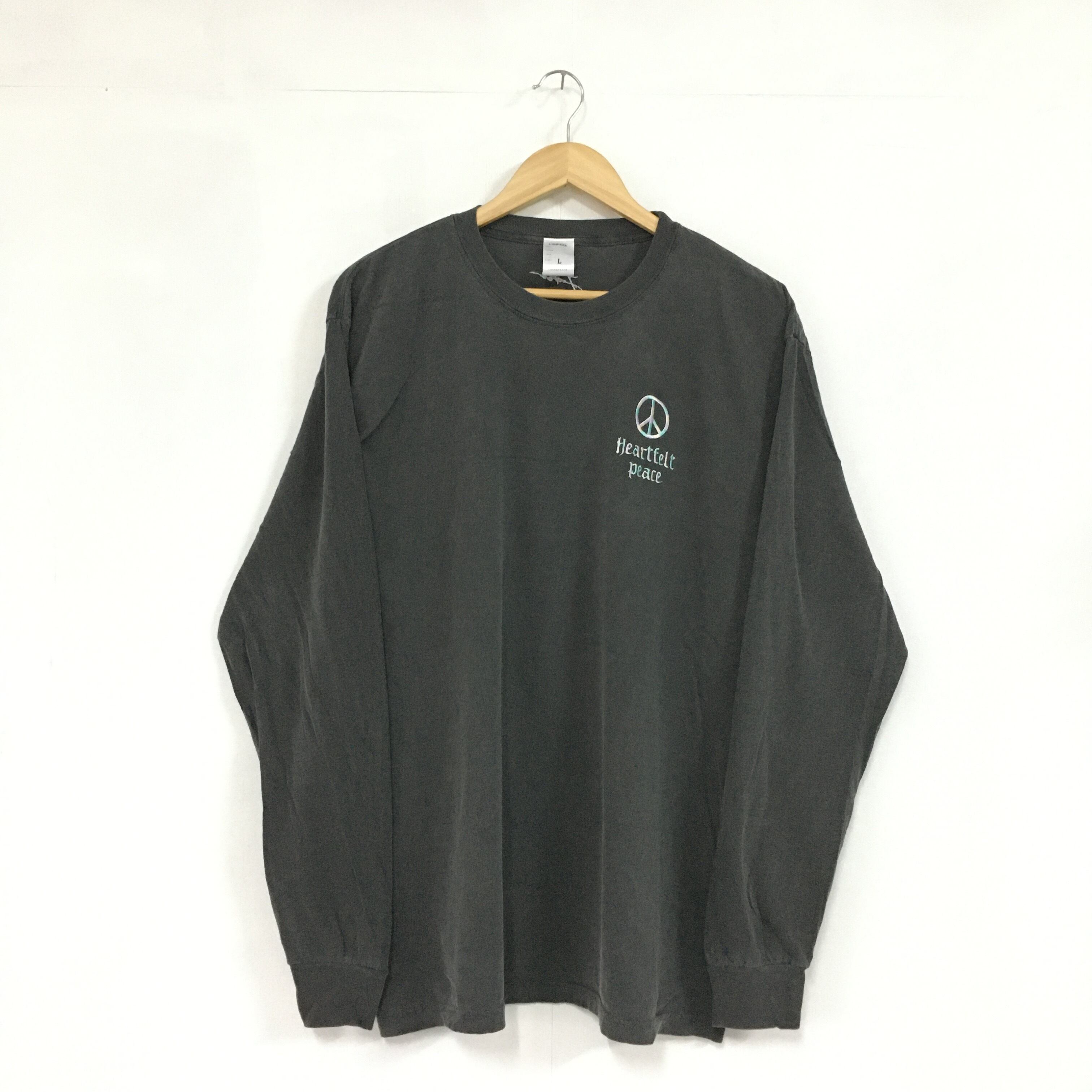 単純にフェードがかかった生地と色味、このフォルムを見た時にPEACEマークがはまりそうだと思いそこに乗せるPEACEマークを描きそれだけではさっぱりし過ぎるのでそこに添える文字をと考えた時に浮かんだHEARTFELT PEACE(心からの平和)の文字と共に心からを表す様に心臓の上に配置しました。