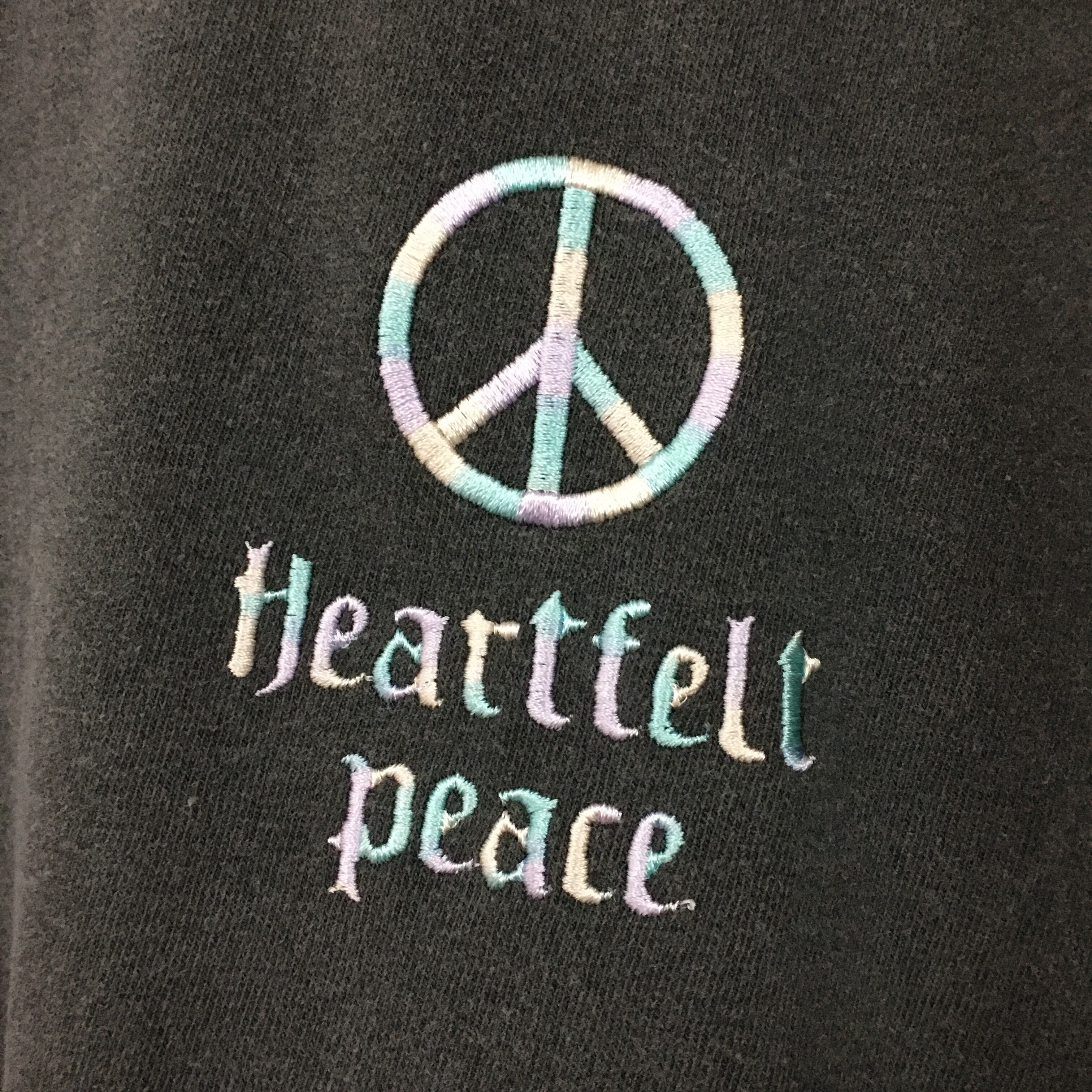 PEACEマークとHEARTFELT PEACE(心からの平和)と刺繍したスウェットになります。