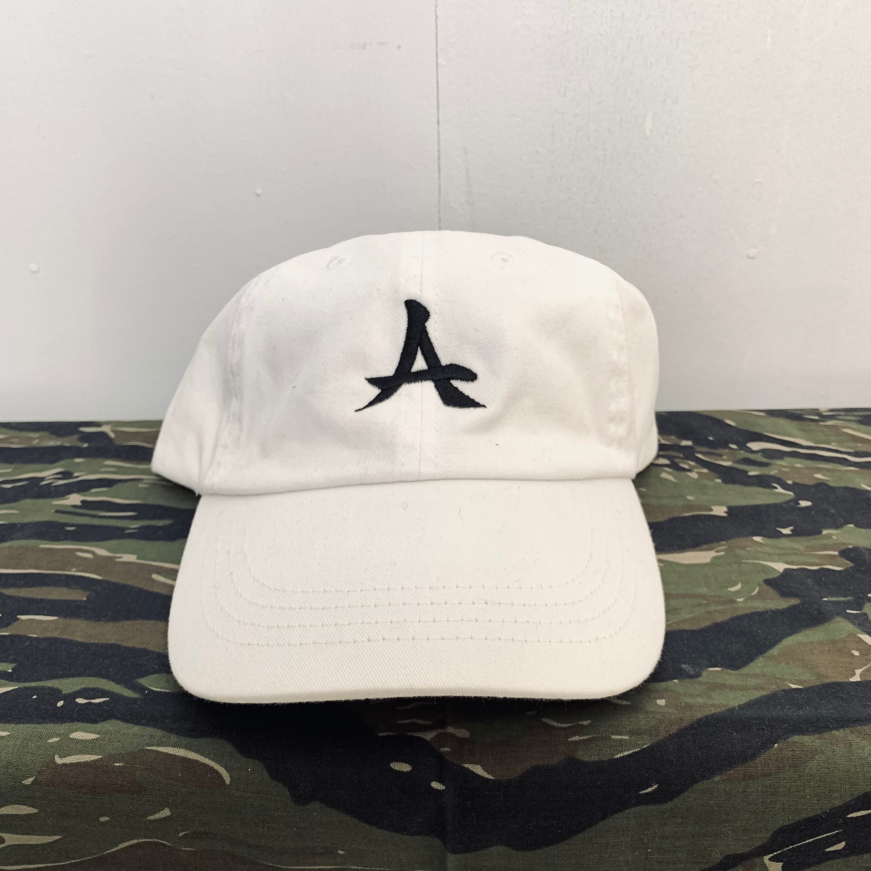 じーさんが被っている訳分からん野球帽からインスパイアされ持っていた白の無地ボディのキャップに黒で刺繍した世界に一個しか存在しない帽子になります。